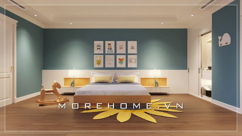 Nội thất phòng ngủ trẻ em hiện đại, giường ngủ gỗ công nghiệp với sự kết hợp hài hòa màu sắc tạo điểm nhấn nổi bật cho cả không gian