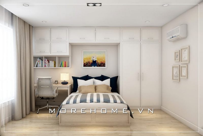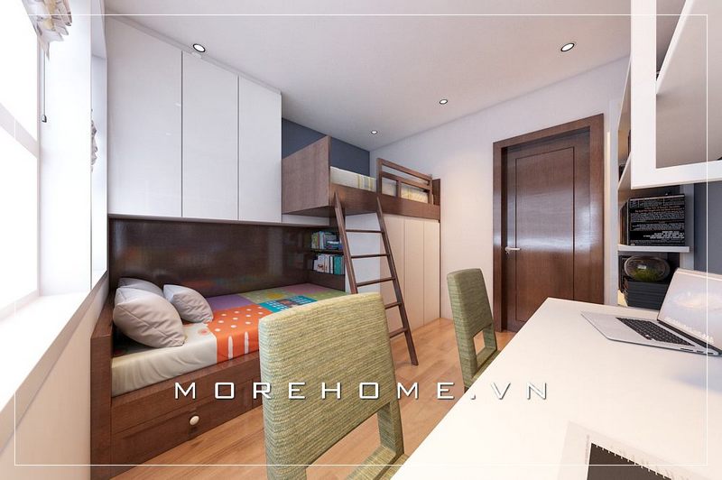 Giường ngủ trẻ em gỗ công nghiệp được thiết kế theo phong cách hiện đại, trẻ trung, KTS lựa chọn gam màu trắng đồng bộ với nội thất khác trong căn phòng tạo nên sự thoáng đãng hơn cho căn phòng ngủ nhỏ