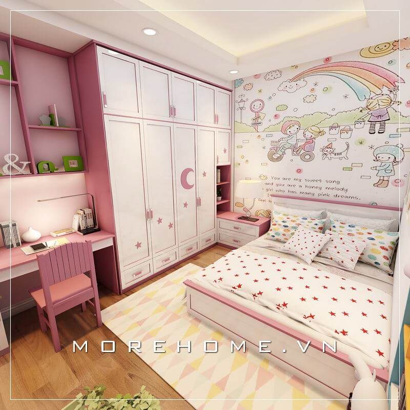 Trang trí nội thất phòng ngủ bé gái xinh xắn, đáng yêu, chiếc bàn học được bố trí trong phòng giúp con có một không gian nghỉ ngơi và học tập thoải mái nhất