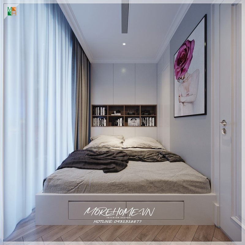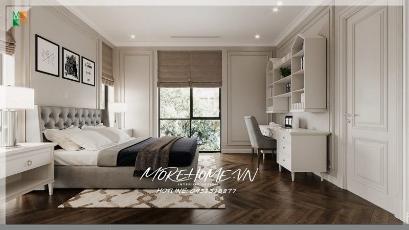 . Phòng ngủ có thiết kế sàn gỗ công nghiệp với gam màu đồng điệu và nội thất giúp căn phòng trở nên thoáng đãng hơn.
