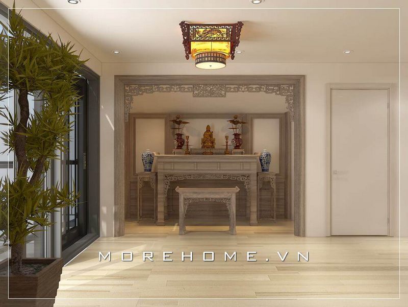 Mẫu bàn thờ chung cư với họa tiết họa văn đơn giản nhưng tinh tế đem lại nét đẹp nổi bật cho căn phòng.